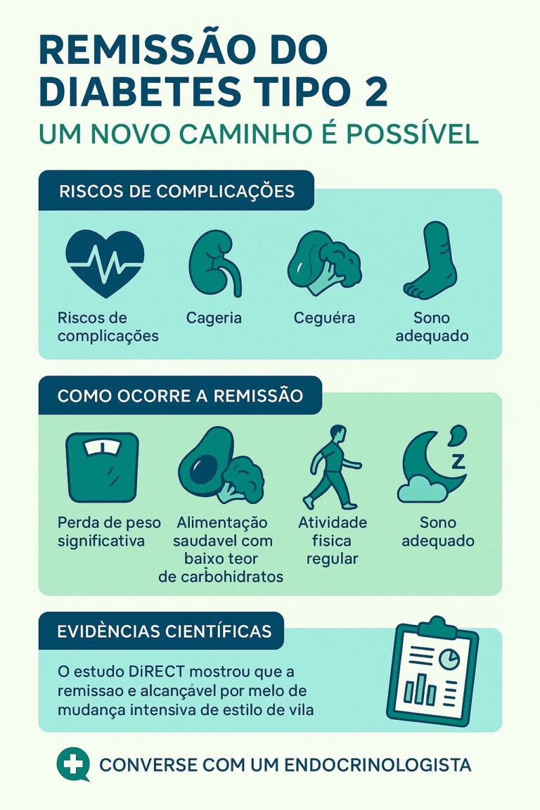 A remissão do diabetes tipo 2 é definida como níveis normais de glicemia (HbA1c < 6,5%) mantidos por pelo menos três meses, na ausência do uso de medicamentos para diabetes. Estudos como o DiRECT Trial, realizado no Reino Unido, demonstraram que até 46% dos pacientes conseguiram atingir remissão após um ano de intervenção com perda significativa de peso, por meio de mudanças intensas na alimentação e estilo de vida (Lean et al., 2018).